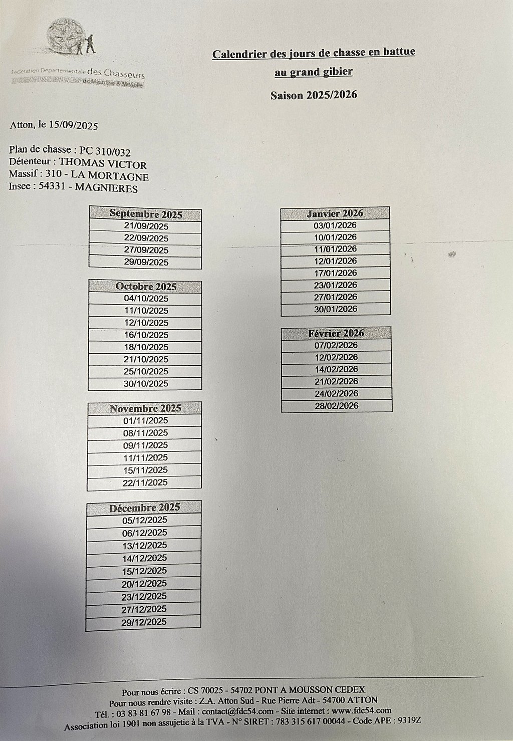 Ci-joint le calendrier de chasse Victor Thomas pour la saison 2025/2026.