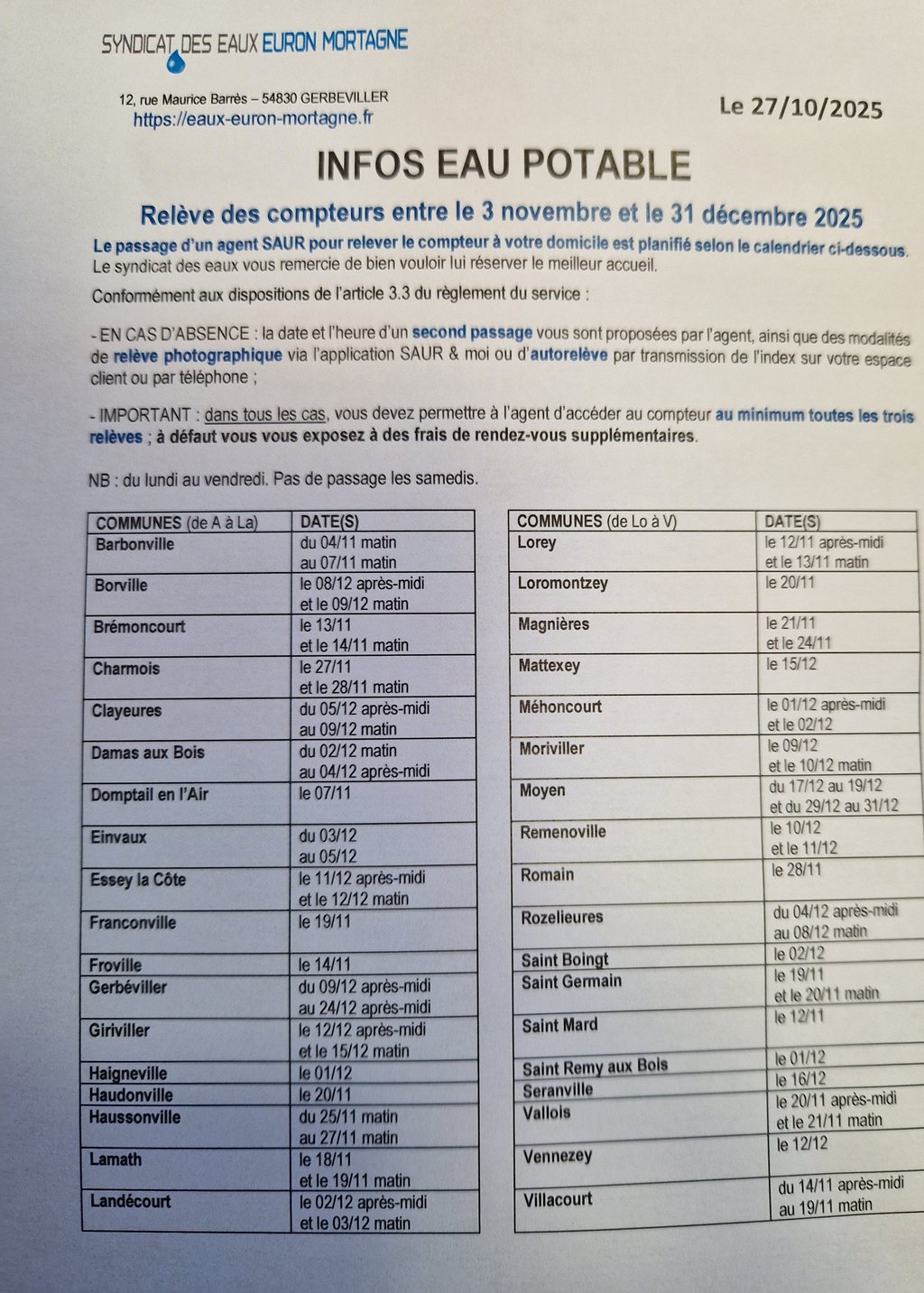 Pour l'occasion, un agent de la Saur passera à vos domiciles.